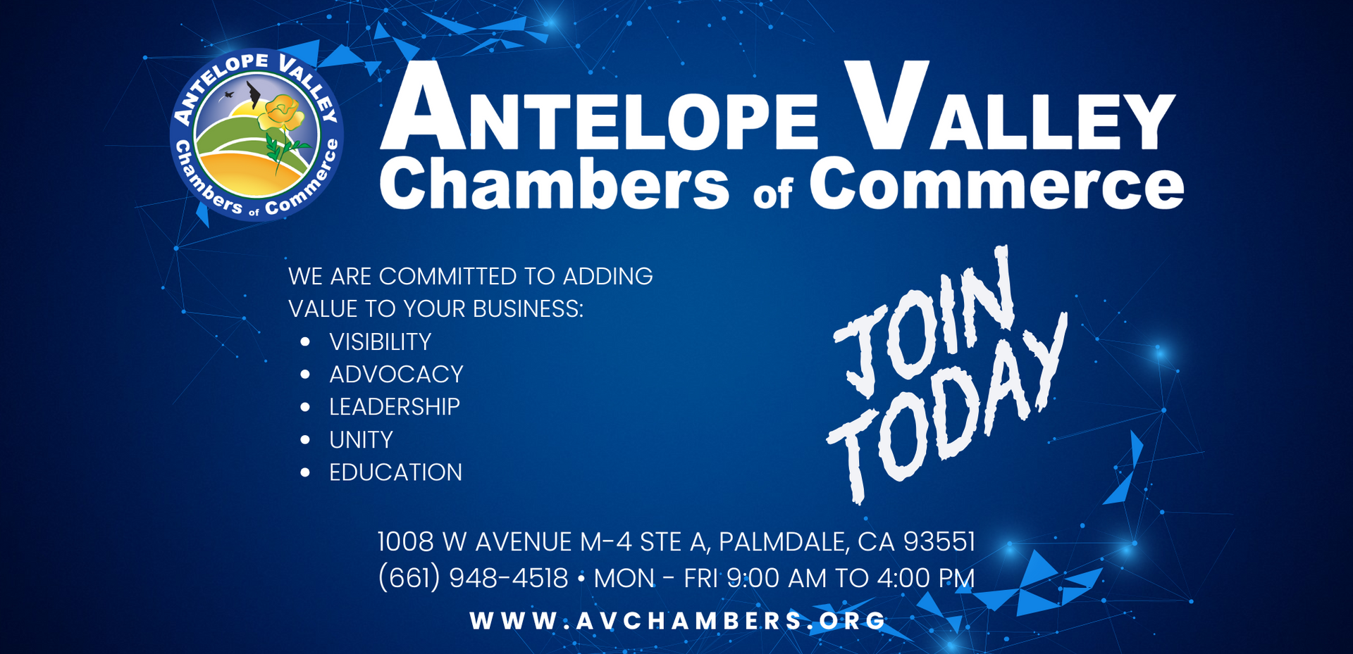 For over 120 years, the Lancaster and Palmdale Chambers of Commerce have been serving as a regional representatives for the interests of local businesses located in the greater Antelope Valley. They have now joined together to create the new Antelope Valley Chambers of Commerce.